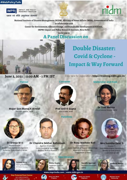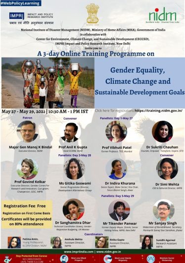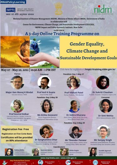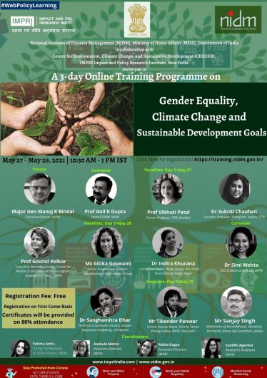 This online training is organized by National Institute of Disaster Management (NIDM), Ministry of Home Affairs, Government of India and Center for Environment, Climate Change and Sustainable Development at IMPRI.