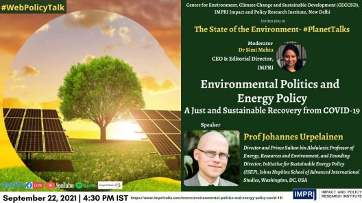 Prof Johannes Urpelainen (Director and Prince Sultan bin Abdulaziz Professor of Energy, Resources and Environment, and Founding Director, Initiative for Sustainable Energy Policy (ISEP), Johns Hopkins School of Advanced International Studies, Washington, DC, USA) on Environmental Politics and Energy Policy: A Just and Sustainable Recovery from COVID-19