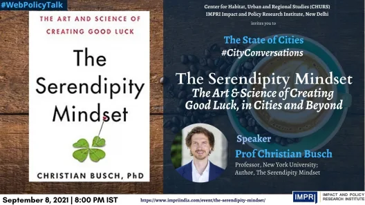 Cities and employment are the focal point of this week's #WebPolicyTalks at IMPRI, with talks on The Serendipity Mindset: The Art & Science of Creating Good Luck, in Cities and Beyond; Urban Water, Food and Waste Cycling, and Socio-economic Equity, and the e-SHRAM Database for Unorganised Workers. We hope you are able to join us for one of these, or for more in the coming weeks.