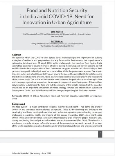 Food and Nutrition Security in India amid COVID-19: Need for Innovation in Urban Agriculture by Simi Mehta and Rattan Lal | Urban India • Vol 41 (I) • January - June 2021, National Institute of Urban Affairs (NIUA), New Delhi