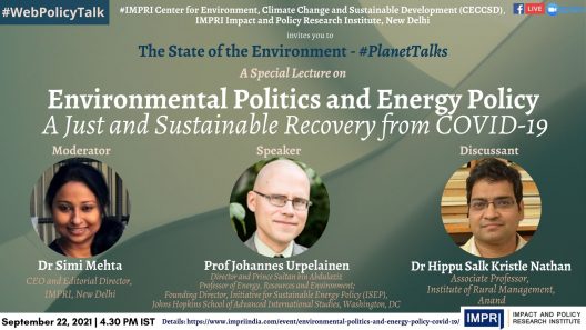 Prof Johannes Urpelainen (Director and Prince Sultan bin Abdulaziz Professor of Energy, Resources and Environment, and Founding Director, Initiative for Sustainable Energy Policy (ISEP), Johns Hopkins School of Advanced International Studies, Washington, DC, USA) on Environmental Politics and Energy Policy: A Just and Sustainable Recovery from COVID-19