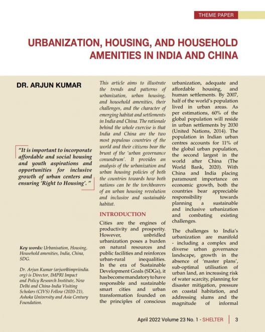Urbanisation, housing, and household amenities in India and China by Arjun Kumar | SHELTER, Volume 23, No.1, April 2022, Theme Paper, published by HSMI, HUDCO
