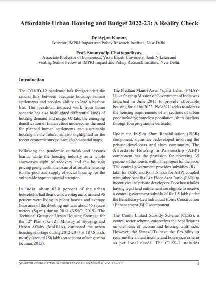 Affordable Urban Housing and Budget 2022-23: A Reality Check by Arjun Kumar & Soumyadip Chattopadhyay | The Urban World, Vol 15, Issue 2, 2022, pages 01-07 Journal published by Regional Centre for Urban and Environmental Studies (RCUES), AIILSG, Mumbai, at All India Institute of Local Self-Government (AIILSG), Mumbai