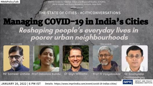 Discussants: Prof M. Vijayabaskar (Madras Institute of Development Studies, Chennai), Prof Debolina Kundu (National Institute of Urban Affairs, New Delhi), Sameer Unhale (Department of Municipal Administration, Government of Maharashtra)